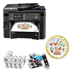 This item contains a brand new Epson WF-3640 inkjet printer directly from Epson, a full set of Inkedibles refillable edible ink cartridges (1 each compatible Epson T252XL120 Black edible ink cartridge, T252XL220 cyan edible ink cartridge, T252XL320 magenta edible ink cartridge, T252XL420 yellow edible ink cartridge) and a full set of cleaning cartridges (1 each Epson T252XL120 Black Inkedibles cleaning cartridge, T252XL220 cyan Inkedibles cleaning cartridge, T252XL320 magenta Inkedibles cleaning cartridge, T252XL420 yellow Inkedibles cleaning cartridge). Inkedibles premium brand edible inks are FDA compliant, and the best quality inks for your cake and edible ink requirements, producing beautiful prints for cake decorators and bakeries. Print with Inkedible Inks for Incredible Cakes! Also included with the software are features such as the Auto Photo Fix, which corrects redeye and enhances your images. This is the perfect starter bundle for someone just getting into cake printing (for this low price, you get a brand new printer and a full set of FULL edible ink cartridges to get you started!). Or if you are a pro cake printer and decorator, this would be a nice new printer set to supplement your operation.