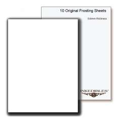 This item includes Inkedibles Original Frosting Sheets in a sample pack size of 10 sheets. These carefully prepared frosting sheets work perfectly with edible inks and come with a peel-off backing that is easy to remove when you are ready to apply the printed frosting sheet to your cake. Simply feed the frosting sheet through the printer as you would a regular piece of paper, print with edible ink, and apply the printed frosting sheet to your cake.